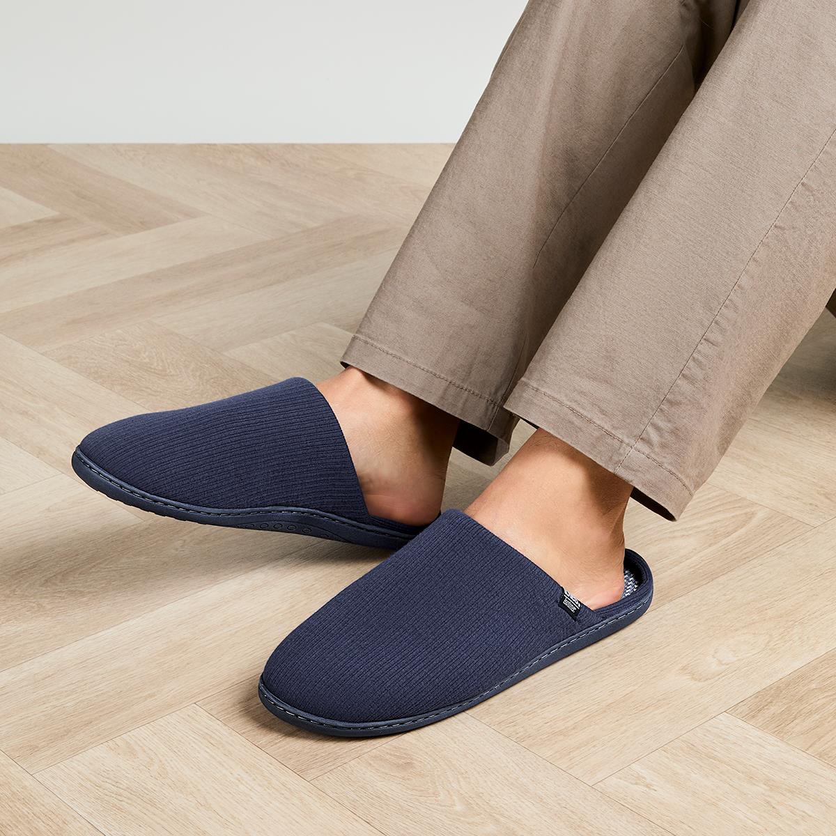 A cool and casual, classically styled mule slipper in a ribbed fabric with patterned sock. This perfect slip-on style, available in either smart navy or black, will take you effortlessly through the seasons. Super soft, our best-selling shape and featuring our Ergo sole which mirrors the natural silhouette of your foot with a slightly elevated heel for added support and comfort where it’s needed most.