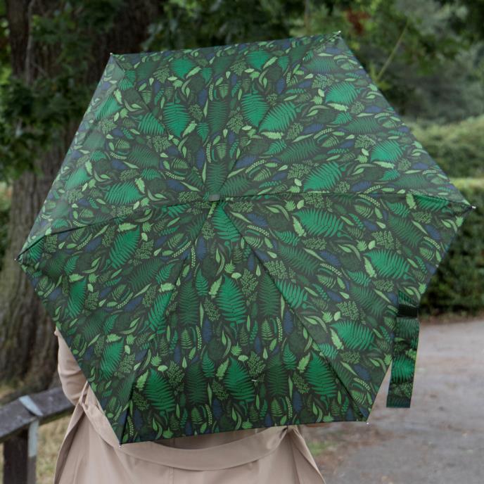 This compact, flat umbrella comes in our fern and features our 5 section steel frame with chrome plating and 100% Recycled polyester canopy.