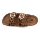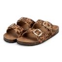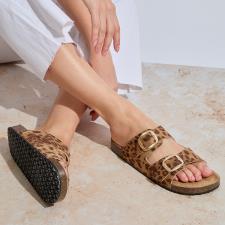 Timeless slip-on slide design with adjustable double buckles for a tailored fit. Flexible, lightweight and the perfect co-ordinate for your summer wardrobe. With a cork effect sole and an upper in a choice of either a soft sand shade or a classic light leopard print, a comfort heel patch and moulded footbed that supports your natural foot shape, summer - here we come!